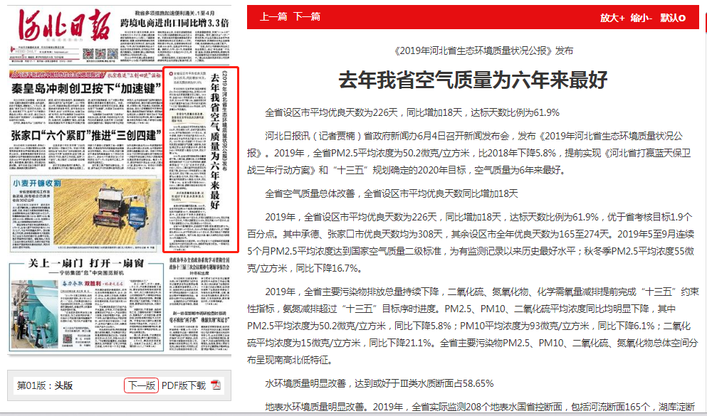 河北日报讯(记者贾楠)省政府新闻办6月4日召开新闻发布会,发布《2019年河北省生态环境质量状况公报》。2019年,全省PM2.5平均浓度为50.2微克/立方米,比2018年下降5.8%,提前实现《河北省打赢蓝天保卫战三年行动方案》和“十三五”规划确定的2020年目标,空气质量为6年来最好。