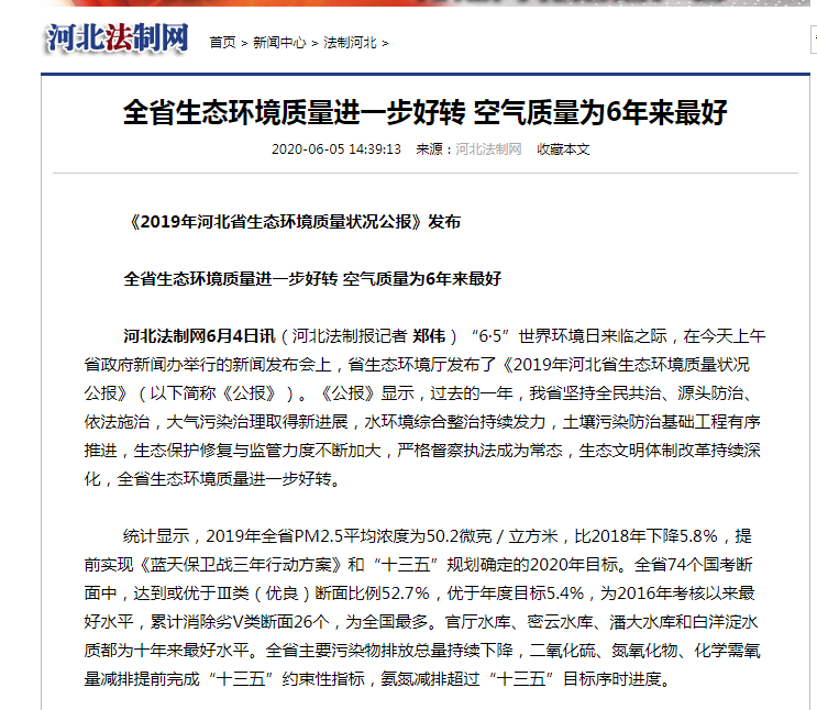 河北法制网:全省生态环境质量进一步好转 空气质量为6年来最好