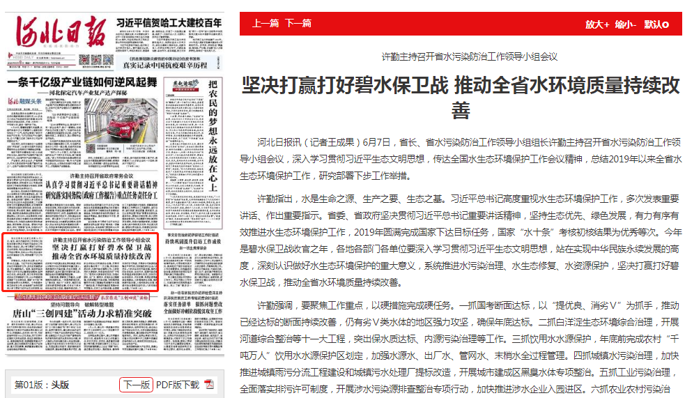许勤强调,要加强组织领导,做到责任落实到位、考核问责到位、监督执法到位、服务企业到位、宣传引导到位。制定水污染防治若干举措,对涉水“散乱污”企业整治开展回头看,建立全省废水排放台账,构建条块结合的网格化管理体系,完善相关领域立法,确保完成水污染防治各项目标任务,为新时代全面建设经济强省、美丽河北作出新的贡献。