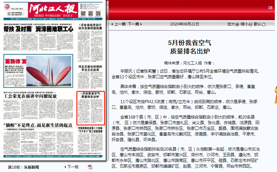 公布5月全省环境空气质量排名情况。全省11个设区市中,张家口空气质量最好,唐山降至末位。