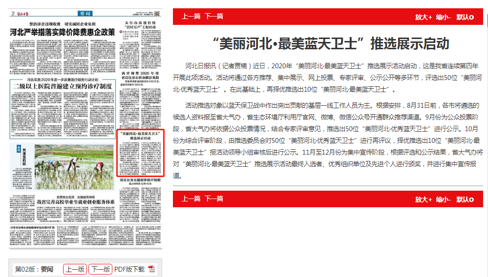 河北日报讯(记者贾楠)近日,2020年“美丽河北·最美蓝天卫士”推选展示活动启动,这是我省连续第四年开展此项活动。活动将通过各方推荐、集中展示、网上投票、专家评审、公示公开等多环节,评选出50位“美丽河北·优秀蓝天卫士”。在此基础上,再择优推选出10位“美丽河北·最美蓝天卫士”。