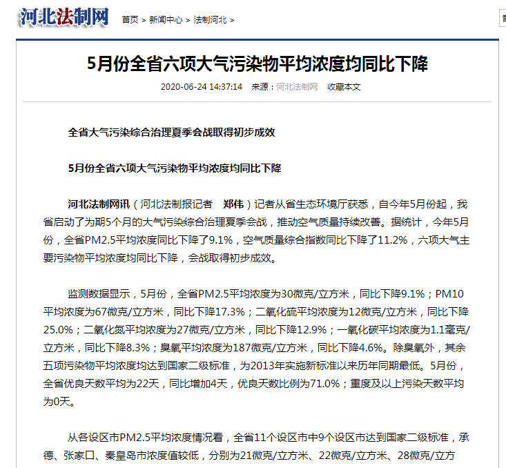 获悉,自今年5月份起,我省启动了为期5个月的大气污染综合治理夏季会战,推动空气质量持续改善。据统计,今年5月份,全省PM2.5平均浓度同比下降了9.1%,空气质量综合指数同比下降了11.2%,六项大气主要污染物平均浓度均同比下降,会战取得初步成效。