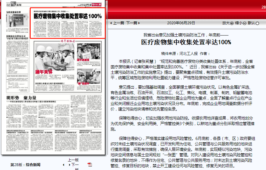 本报讯(记者张莉慧)“规范和完善医疗废物分类收集处置体系,年底前,全省医疗废物集中收集和集中处置率达到100%。”近日,我省出台《关于进一步加强全省土壤污染防治工作的实施意见》提出,要聚焦重点领域,有效提升土壤污染防治水平,统筹区域危险废物利用处置能力建设,严格危险废物经营许可审批。