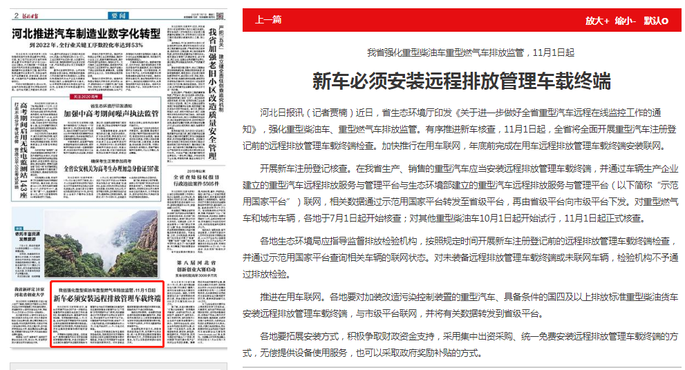 河北日报讯(记者贾楠)近日,杏彩(中国)官方网站 印发《关于进一步做好全省重型汽车远程在线监控工作的通知》,强化重型柴油车、重型燃气车排放监管。有序推进新车核查,11月1日起,全省将全面开展重型汽车注册登记前的远程排放管理车载终端检查。加快推行在用车联网,年底前完成在用车远程排放管理车载终端安装联网。
