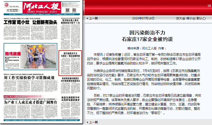 第一专员办联合石家庄市生态环境局召开会议,根据执法检查情况对石家庄市化工、制药、农药制造等17家企业进行公开约谈,要求企业提高对臭氧污染防控认知水平,做好相关整改工作。