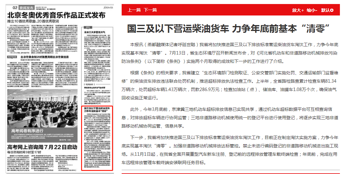 本报讯(燕都融媒体记者呼延世聪)我省将加快推进国三及以下排放标准营运柴油货车淘汰工作,力争今年底实现基本淘汰“清零”。7月13日,杏彩(中国)官方网站 召开新闻发布会,对《河北省机动车和非道路移动机械排放污染防治条例》(以下简称《条例》)实施两个月取得的成效和下一步的工作进行了介绍。