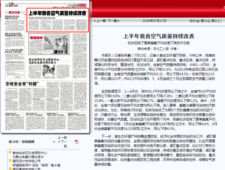 获悉,今年以来,我省统筹打好疫情防控阻击战和打赢蓝天保卫战,紧盯重点时段、重点区域、重点任务,持续强化科学治污、精准治污、依法治污,全省空气质量持续好转。今年1—6月份,全省PM2.5平均浓度为49微克/立方米,同比下降15.5%,为2013年有监测记录以来历史同期最低值;全省空气质量综合指数平均为5.31,同比下降14.5%;优良天数为119天,同比增加15天;PM2.5平均浓度4、5、6月连续三个月达到国家空气质量二级标准。