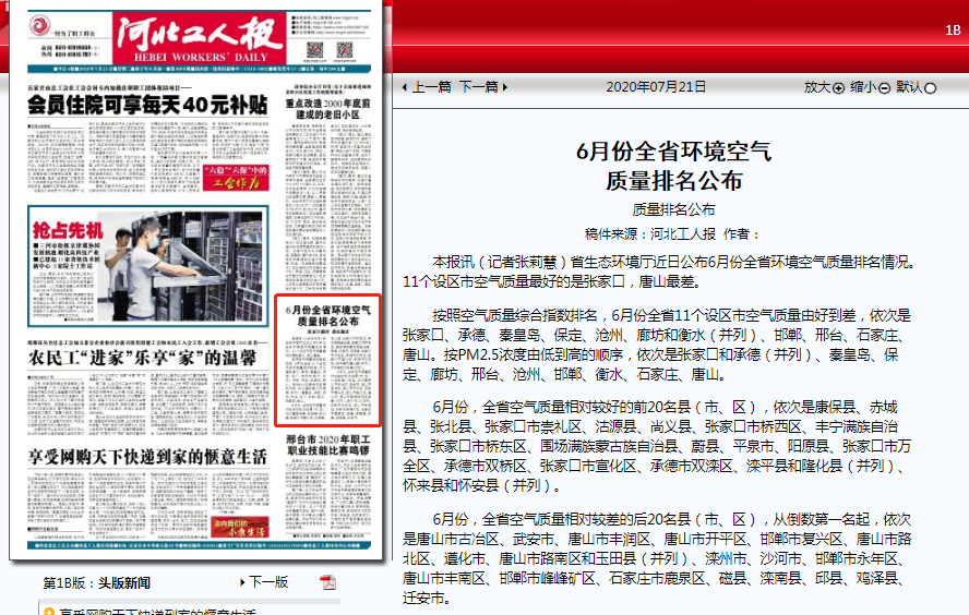 按照空气质量综合指数排名,6月份全省11个设区市空气质量由好到差,依次是张家口、承德、秦皇岛、保定、沧州、廊坊和衡水(并列)、邯郸、邢台、石家庄、唐山。按PM2.5浓度由低到高的顺序,依次是张家口和承德(并列)、秦皇岛、保定、廊坊、邢台、沧州、邯郸、衡水、石家庄、唐山。