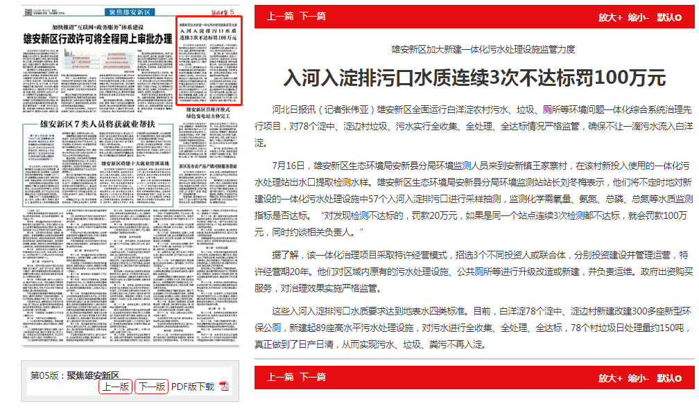 7月16日,雄安新区生态环境局安新县分局环境监测人员来到安新镇王家寨村,在该村新投入使用的一体化污水处理站出水口提取检测水样。雄安新区生态环境局安新县分局环境监测站站长刘冬梅表示,他们将不定时地对新建设的一体化污水处理设施中57个入河入淀排污口进行采样抽测,监测化学需氧量、氨氮、总磷、总氮等水质监测指标是否达标。“对发现检测不达标的,罚款20万元,如果是同一个站点连续3次检测都不达标,就会罚款100万元,同时约谈相关负责人。”