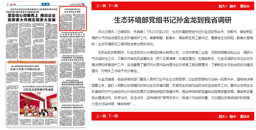 在邢台和邯郸期间,孙金龙到河北中煤旭阳焦化有限公司、沙河市玻璃工业园、河钢邯钢等地和企业,调研大气污染防治工作,了解环评审批和监督执法“两个正面清单”的落实情况。在雄安新区,孙金龙调研白洋淀生态环境治理和修复保护工作,实地查看了唐河污水库污染治理与生态修复工程进展情况,了解新区生态安全规划与建设情况,对相关工作给予充分肯定。