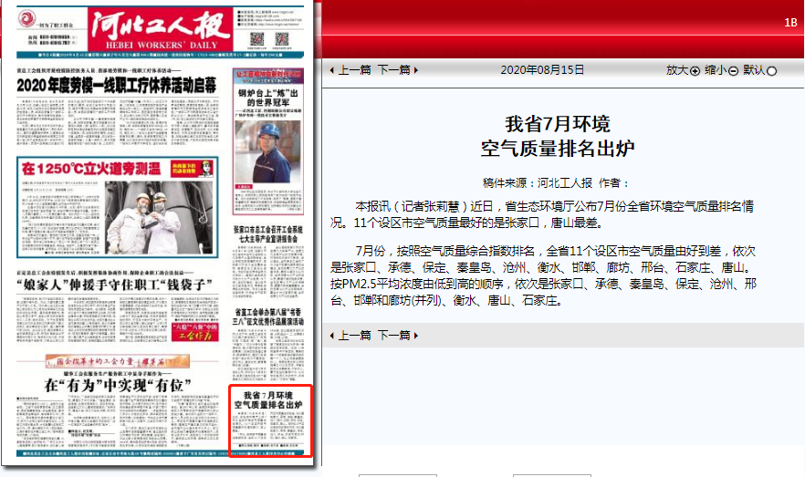 河北日报:我省公布7月份全省环境空气质量排名 张家口空气质量最好