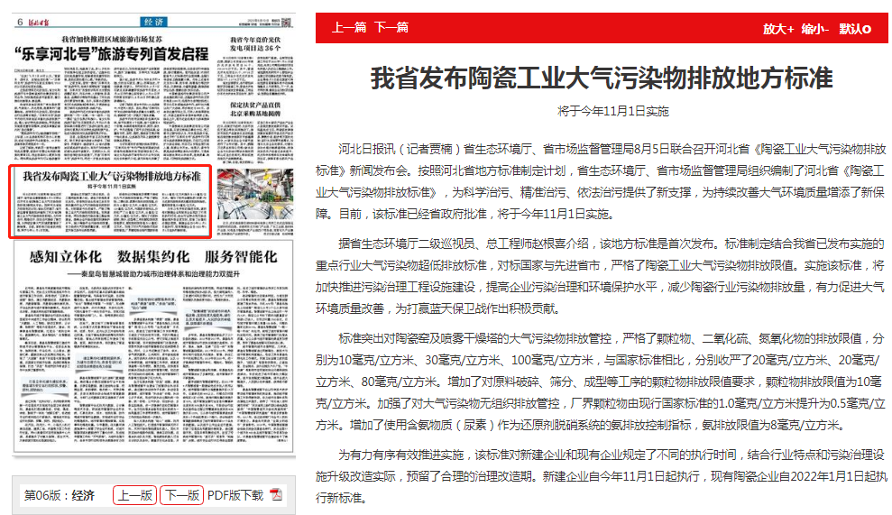 为有力有序有效推进实施,该标准对新建企业和现有企业规定了不同的执行时间,结合行业特点和污染治理设施升级改造实际,预留了合理的治理改造期。新建企业自今年11月1日起执行,现有陶瓷企业自2022年1月1日起执行新标准。