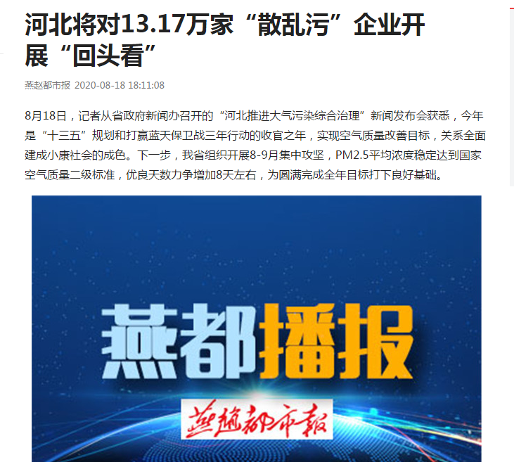 8月18日,记者从省政府新闻办召开的“河北推进大气污染综合治理”新闻发布会获悉,今年是“十三五”规划和打赢蓝天保卫战三年行动的收官之年,实现空气质量改善目标,关系全面建成小康社会的成色。下一步,我省组织开展8-9月集中攻坚,PM2.5平均浓度稳定达到国家空气质量二级标准,优良天数力争增加8天左右,为圆满完成全年目标打下良好基础。