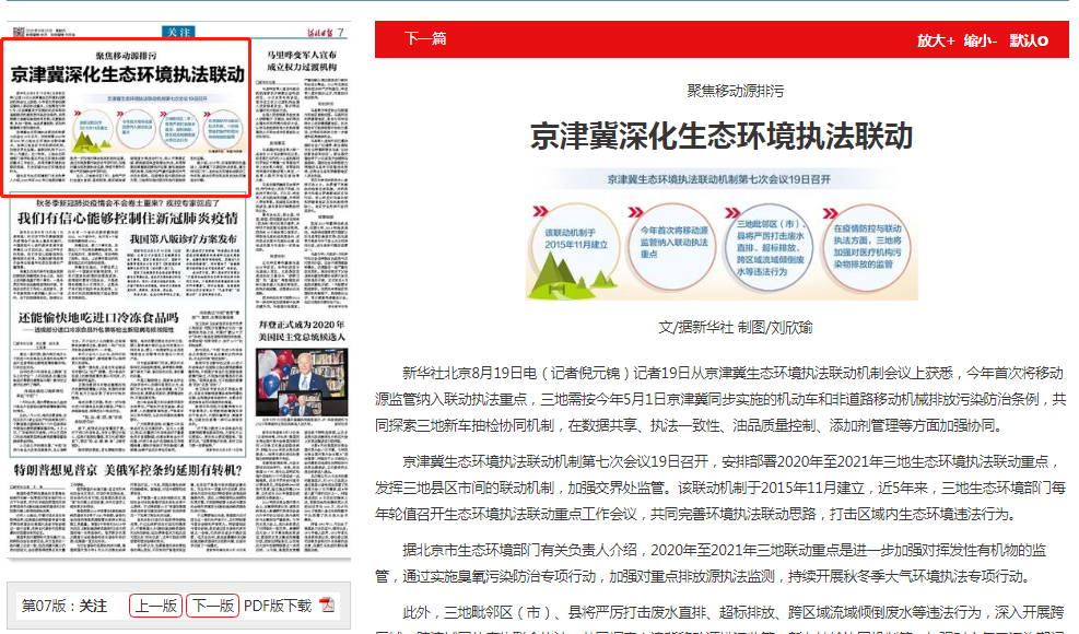 据介绍,2019年,在省级联动的基础上,京津冀下沉联动执法层级,建立相邻区(市)、县的生态环境执法联动工作机制,解决交界处和共同关注的环境违法问题。