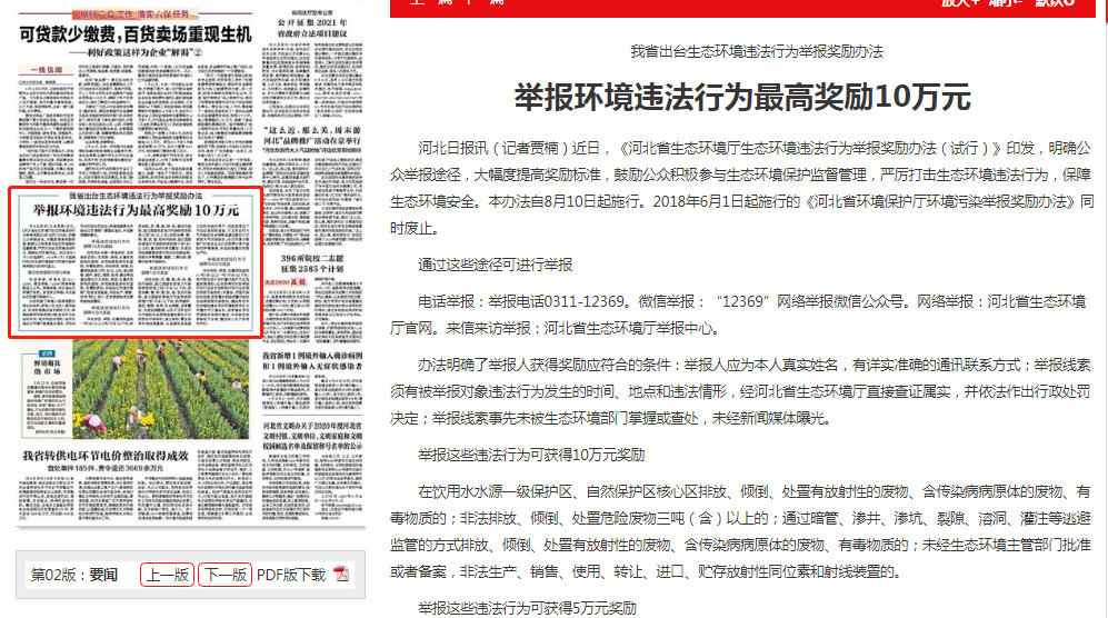 河北日报讯(记者贾楠)近日,《杏彩(中国)官方网站 生态环境违法行为举报奖励办法(试行)》印发,明确公众举报途径,大幅度提高奖励标准,鼓励公众积极参与生态环境保护监督管理,严厉打击生态环境违法行为,保障生态环境安全。本办法自8月10日起施行。2018年6月1日起施行的《河北省环境保护厅环境污染举报奖励办法》同时废止。