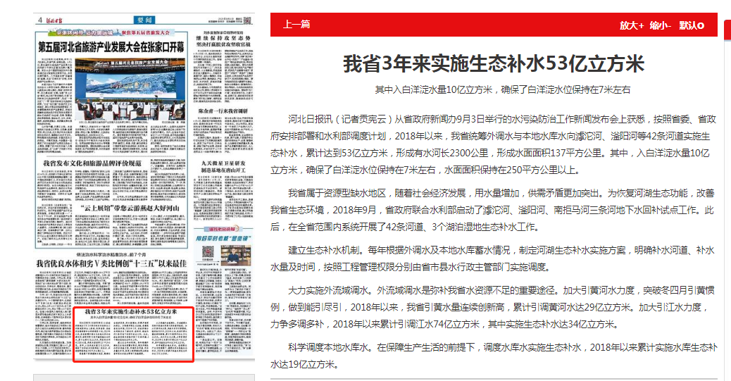 河北日报讯(记者贡宪云)从省政府新闻办9月3日举行的水污染防治工作新闻发布会上获悉,按照省委、省政府安排部署和水利部调度计划,2018年以来,我省统筹外调水与本地水库水向滹沱河、滏阳河等42条河道实施生态补水,累计达到53亿立方米,形成有水河长2300公里,形成水面面积137平方公里。其中,入白洋淀水量10亿立方米,确保了白洋淀水位保持在7米左右,水面面积保持在250平方公里以上。
