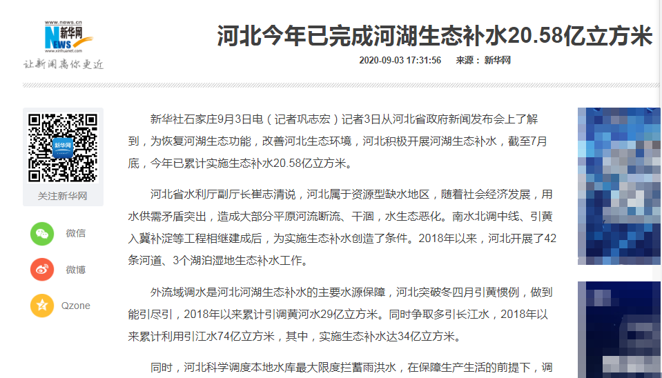新华社石家庄9月3日电(记者巩志宏)记者3日从河北省政府新闻发布会上了解到,为恢复河湖生态功能,改善河北生态环境,河北积极开展河湖生态补水,截至7月底,今年已累计实施生态补水20.58亿立方米。