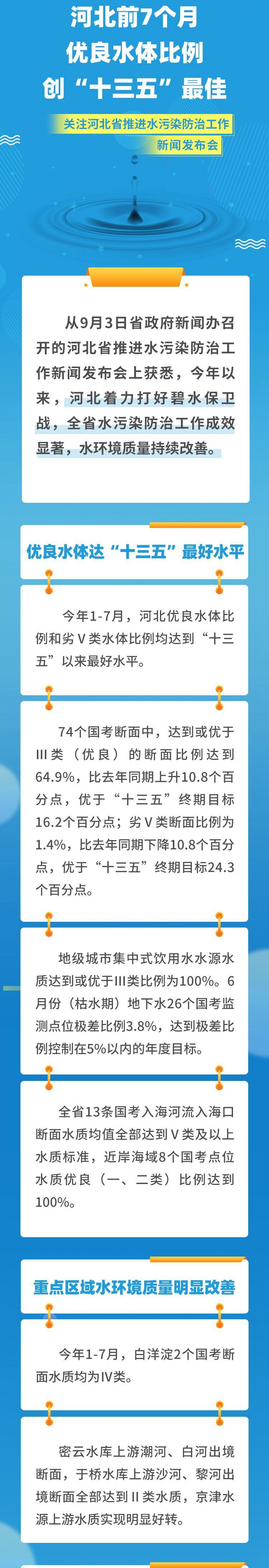 从总体目标完成情况看:今年1—7月,河北省优良水体比例和劣Ⅴ类水体比例均达到“十三五”以来最好水平。74个国考断面中,达到或优于Ⅲ类(优良)的断面比例达到64.9%,比去年同期上升10.8个百分点,优于“十三五”终期目标16.2个百分点;劣Ⅴ类断面比例为1.4%,比去年同期下降10.8个百分点,优于“十三五”终期目标24.3个百分点。地级城市集中式饮用水水源水质达到或优于Ⅲ类比例为100%。6月份(枯水期)地下水26个国考监测点位极差比例3.8%,达到极差比例控制在5%以内的年度目标。全省13条国考入海河流入海口断面水质均值全部达到Ⅴ类及以上水质标准,近岸海域8个国考点位水质优良(一、二类)比例达到100%。