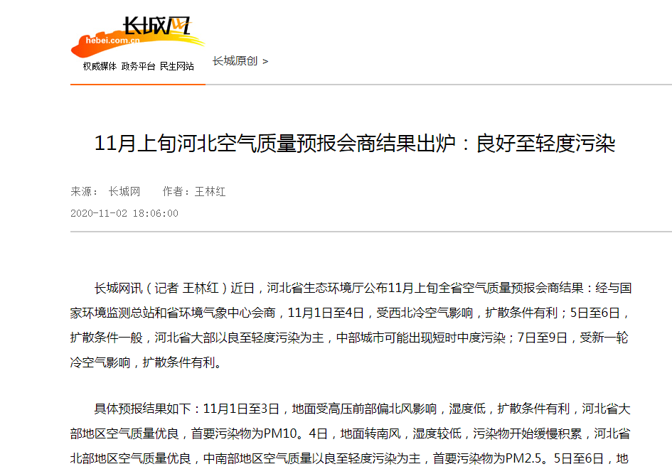 具体预报结果如下:11月1日至3日,地面受高压前部偏北风影响,湿度低,扩散条件有利,河北省大部地区空气质量优良,首要污染物为PM10。4日,地面转南风,湿度较低,污染物开始缓慢积累,河北省北部地区空气质量优良,中南部地区空气质量以良至轻度污染为主,首要污染物为PM2.5。5日至6日,地面受南风持续影响,风力较大,地面湿度升高,中部城市存在污染辐合,河北省大部地区空气质量以良至轻度污染为主,石家庄、保定、廊坊、唐山可能出现短时中度或重度污染,首要污染物为PM2.5。7日至9日,受西北风影响,扩散条件自北向南转好,河北省大部地区空气质量优良,首要污染物为PM10。10日,地面转南风,湿度较低,扩散条件一般,河北省大部以良为主,首要污染物为PM2.5和PM10。