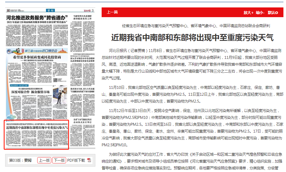 11月10日,我省北部地区空气质量以良至轻度污染为主,中南部以轻度污染为主,石家庄、保定、廊坊、唐山、秦皇岛可能出现中度污染,首要污染物为PM2.5。11日至12日上午,我省北部地区以良至轻度污染为主,南部以轻度污染为主,中部以中度污染为主,首要污染物为PM2.5。