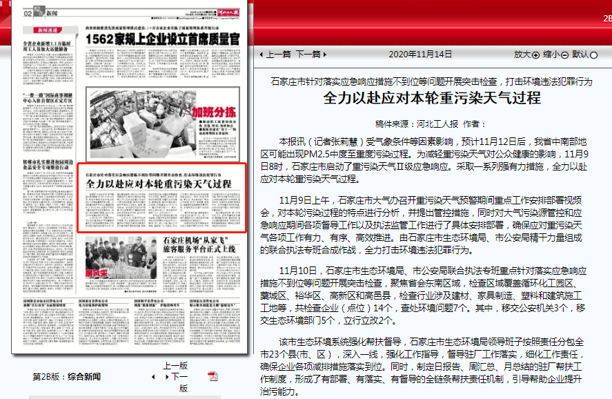 11月9日上午,石家庄市大气办召开重污染天气预警期间重点工作安排部署视频会,对本轮污染过程的特点进行分析,并提出管控措施,同时对大气污染源管控和应急响应期间各项督导工作以及执法监管工作进行了具体安排部署,确保应对重污染天气各项工作有力、有序、高效推进。由石家庄市生态环境局、市公安局精干力量组成的联合执法专班合成作战,全力打击环境违法犯罪行为。