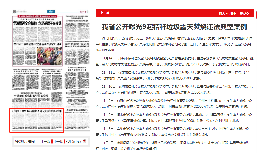 河北日报讯(记者贾楠)为进一步加大对露天焚烧秸秆垃圾等违法行为的打击力度,保障大气环境质量和人民群众健康,增强人民群众遵守大气污染防治有关法律规定的自觉性,近日,杏彩(中国)官方网站 公开曝光了9起露天焚烧违法典型案例。