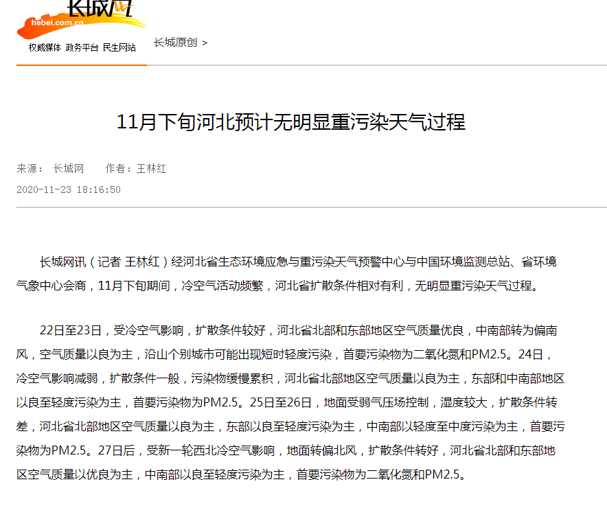 长城网讯(记者 王林红)经河北省生态环境应急与重污染天气预警中心与中国环境监测总站、省环境气象中心会商,11月下旬期间,冷空气活动频繁,河北省扩散条件相对有利,无明显重污染天气过程。