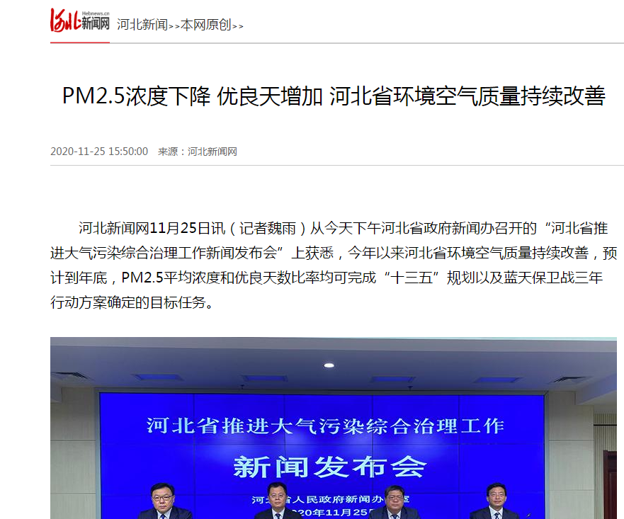 河北新闻网:PM2.5浓度下降 优良天增加 河北省环境空气质量持续改善
