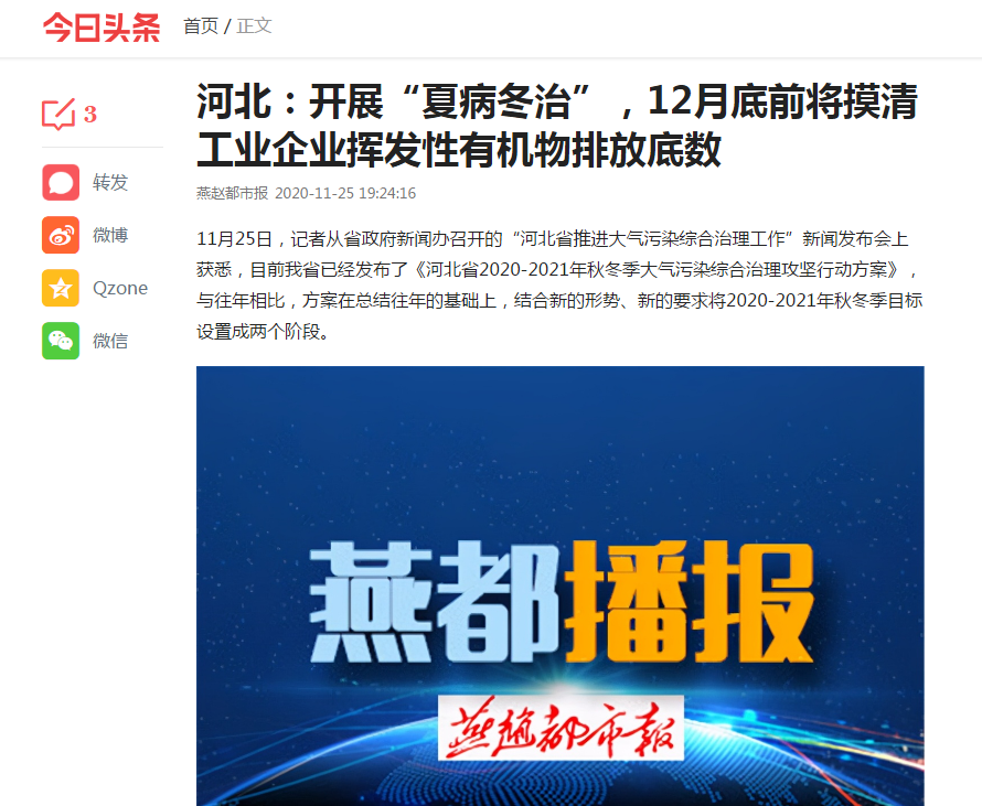 燕赵都市报:河北:开展“夏病冬治”,12月底前将摸清工业企业挥发性有机物排放底数