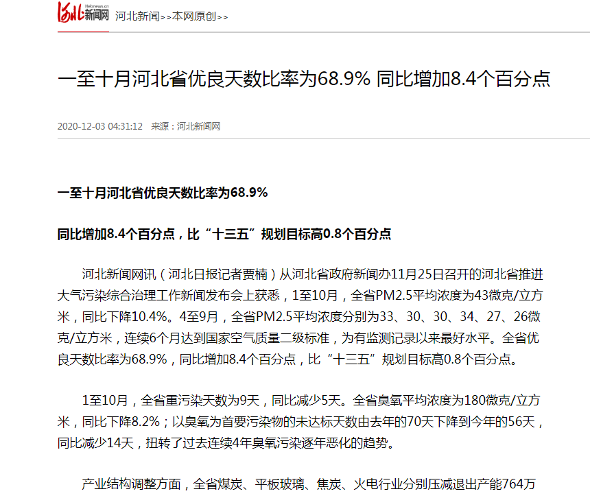 河北新闻网: 一至十月河北省优良天数比率为68.9% 同比增加8.4个百分点