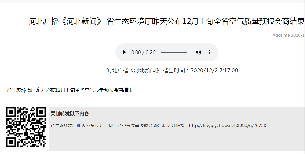 河北广播《河北新闻》:杏彩(中国)官方网站 昨天公布12月上旬全省空气质量预报会商结果