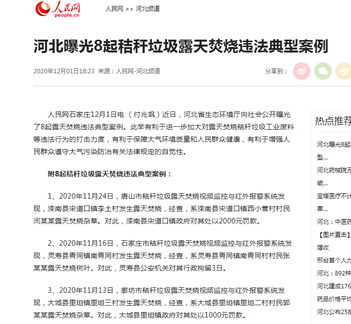 人民网:河北曝光8起秸秆垃圾露天焚烧违法典型案例