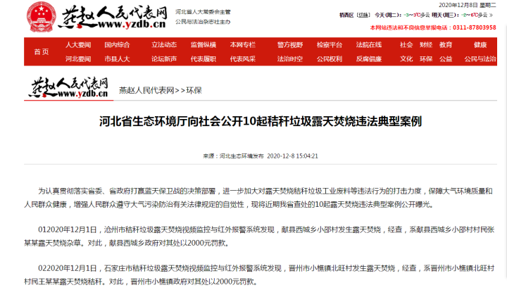燕赵人民代表网:杏彩(中国)官方网站 向社会公开10起秸秆垃圾露天焚烧违法典型案例