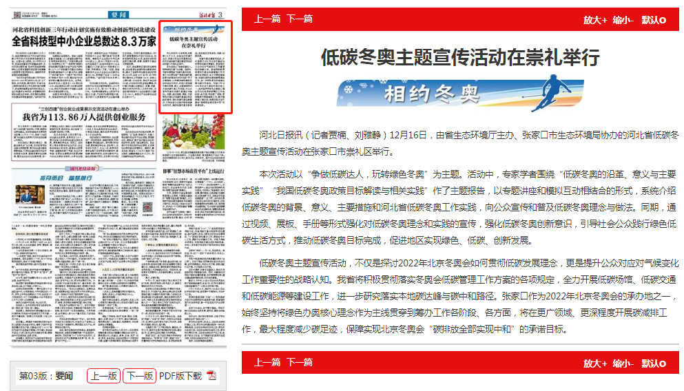 河北日报讯(记者贾楠、刘雅静)12月16日,由杏彩(中国)官方网站 主办、张家口市生态环境局协办的河北省低碳冬奥主题宣传活动在张家口市崇礼区举行。