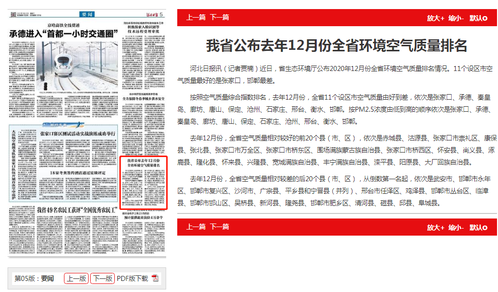 河北日报:我省公布去年12月份全省环境空气质量排名