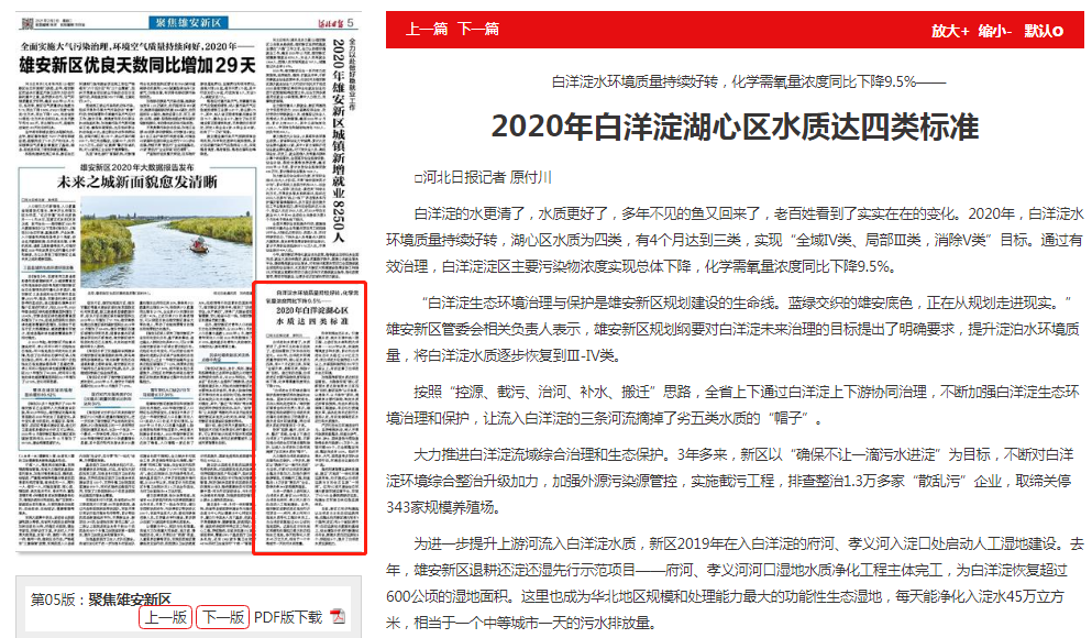 河北日报:2020年白洋淀湖心区水质达四类标准