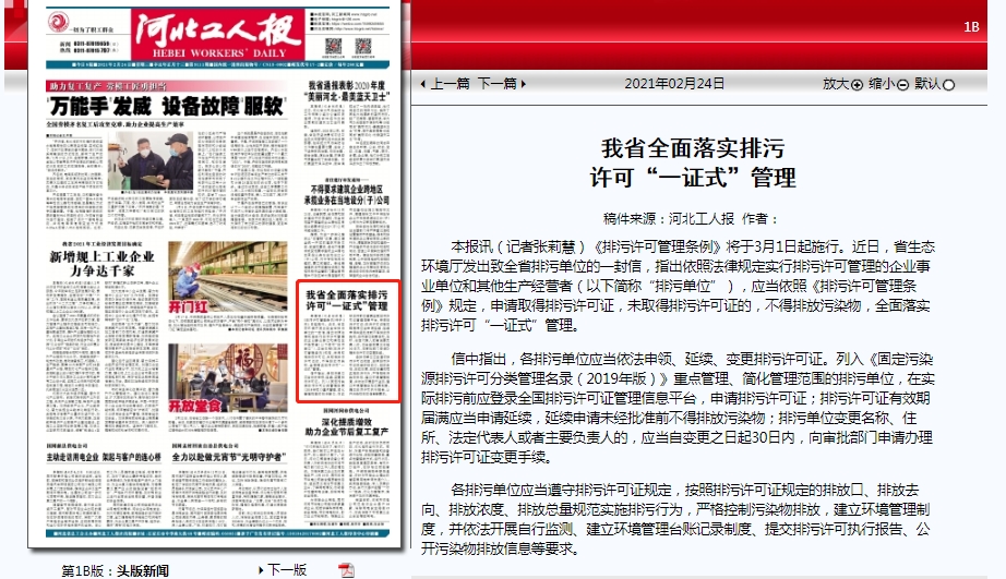 河北工人报:我省全面落实排污许可“一证式”管理