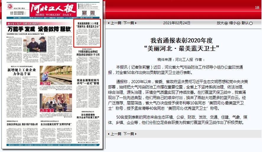 河北工人报:我省通报表彰2020年度“美丽河北·最美蓝天卫士”