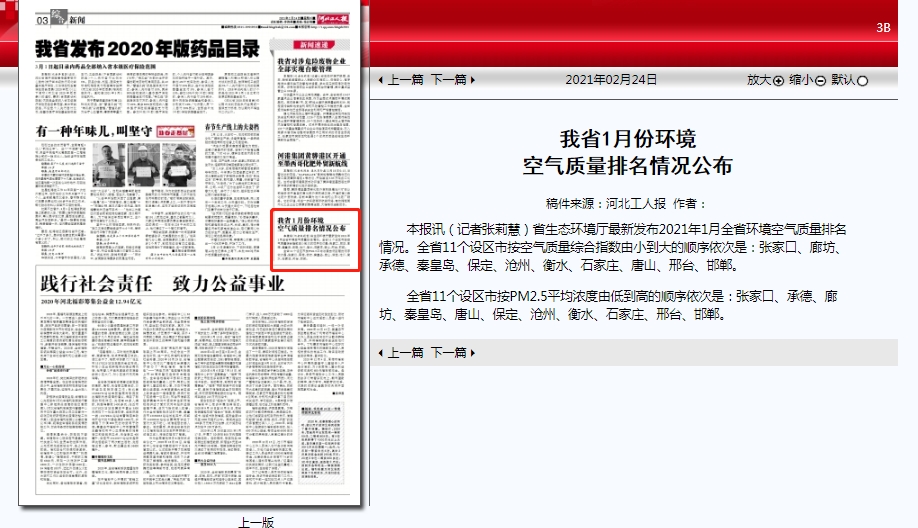河北工人报:我省1月份环境空气质量排名情况公布 来源:河北省生态环境宣传教育中心 时间:2021-02-24