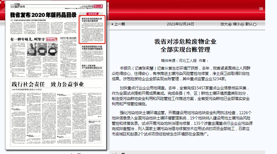 河北工人报:我省对涉危险废物企业全部实现台账管理