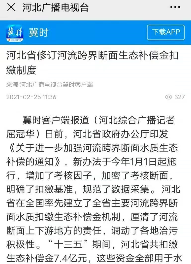河北广播电视台冀时客户端:河北省修订河流跨界断面生态补偿金扣缴制度