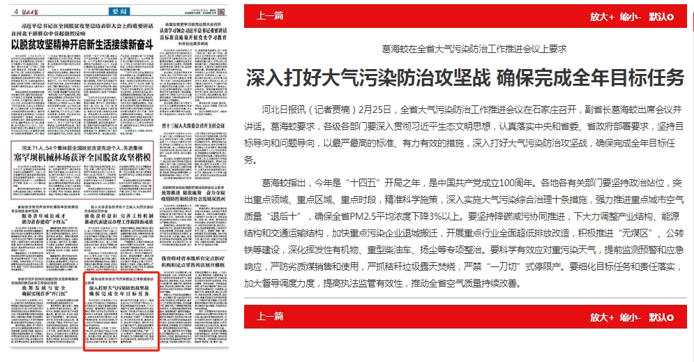 河北日报讯(记者贾楠)2月25日,全省大气污染防治工作推进会议在石家庄召开,副省长葛海蛟出席会议并讲话。葛海蛟要求,各级各部门要深入贯彻习近平生态文明思想,认真落实中央和省委、省政府部署要求,坚持目标导向和问题导向,以最严最高的标准、有力有效的措施,深入打好大气污染防治攻坚战,确保完成全年目标任务。