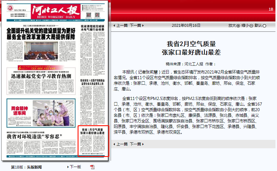 河北工人报:我省2月空气质量 张家口最好唐山最差