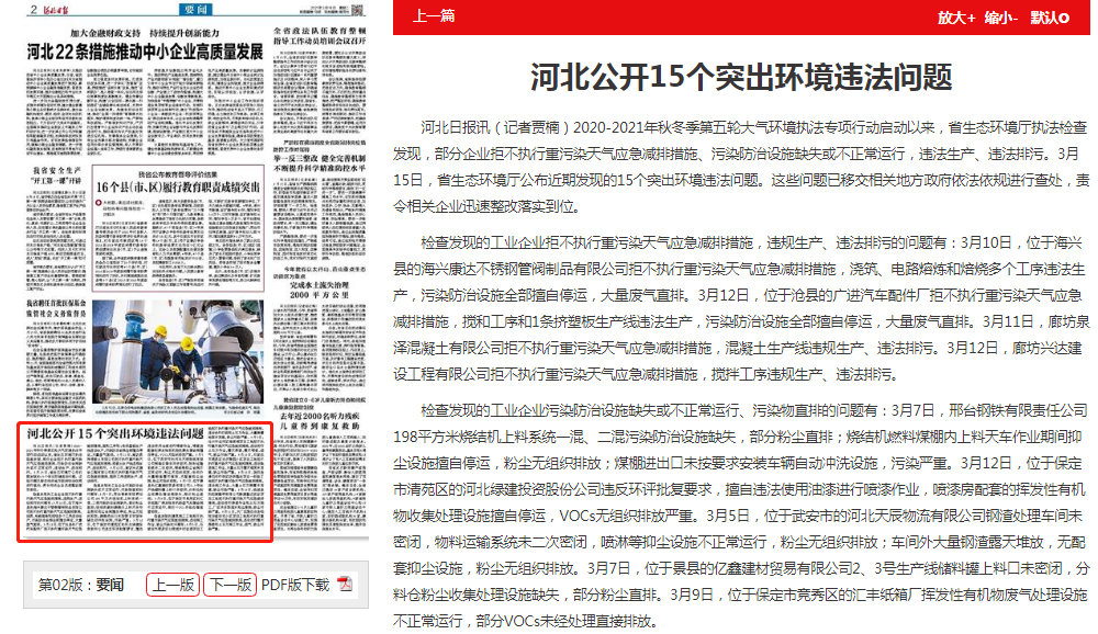 河北日报讯(记者贾楠)2020-2021年秋冬季第五轮大气环境执法专项行动启动以来,杏彩(中国)官方网站 执法检查发现,部分企业拒不执行重污染天气应急减排措施、污染防治设施缺失或不正常运行,违法生产、违法排污。3月15日,杏彩(中国)官方网站 公布近期发现的15个突出环境违法问题。这些问题已移交相关地方政府依法依规进行查处,责令相关企业迅速整改落实到位。