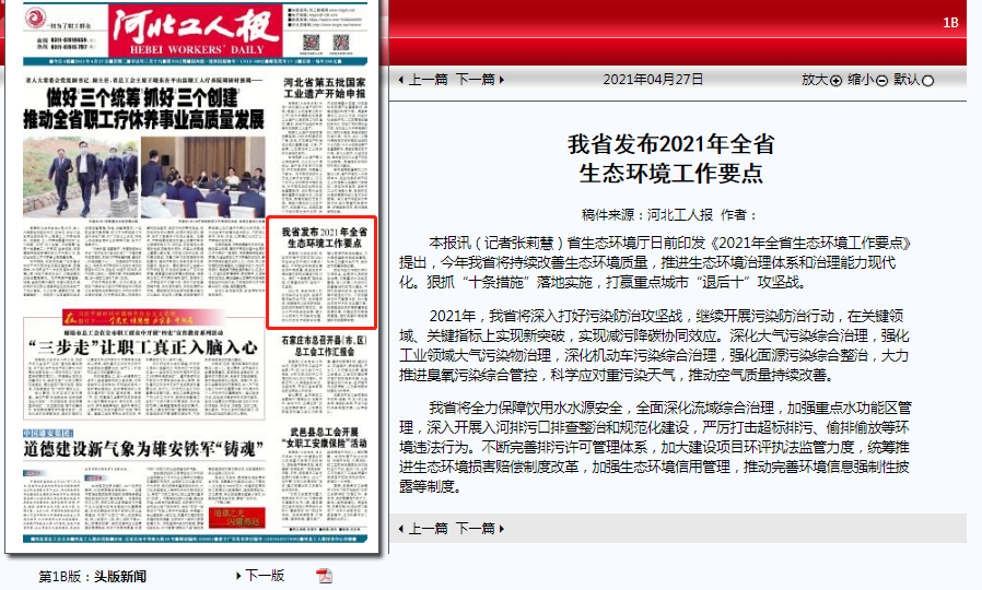 河北工人报:我省发布2021年全省生态环境工作要点