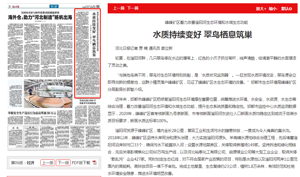 近年来,邯郸市峰峰矿区把修复滏阳河生态环境摆在重要位置,统筹推进水环境、水安全、水资源、水生态等综合治理,着力改善滏阳河生态环境和水域生态功能,提升生态系统质量和稳定性。邯郸市监控中心水质监测数据显示,2020年,峰峰矿区省考核断面九号泉断面、市考核断面滏阳河东武仕入口断面水质均稳定达到或优于Ⅲ类水质目标要求,断面水质达标率100%。