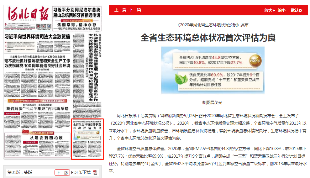 河北日报讯(记者贾楠)省政府新闻办5月26日召开2020年河北省生态环境状况新闻发布会,会上发布了《2020年河北省生态环境状况公报》。2020年,我省生态环境质量实现大幅改善,全省环境空气质量创2013年以来最好水平,水环境质量明显改善,声环境质量总体保持稳定,辐射环境质量总体情况良好,生态环境状况稳中有升,全省生态环境总体状况首次评估为良。