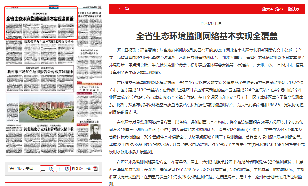 河北日报讯(记者贾楠)从省政府新闻办5月26日召开的2020年河北省生态环境状况新闻发布会上获悉,近年来,我省紧紧围绕打好污染防治攻坚战,不断建立健全监测体系,到2020年底,全省生态环境监测网络基本实现了环境质量、重点污染源、生态状况监测全覆盖,初步建成各环境要素统筹、标准统一、天地一体、上下协同、信息共享的全省生态环境监测网络。