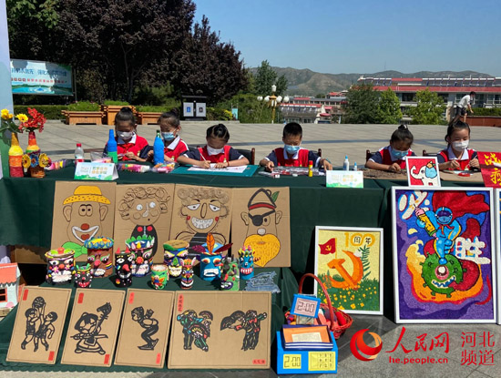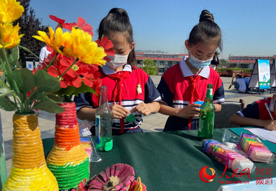 河北省2021年世界环境日主题宣传活动现场,小学生在制作艺术小作品。 人民网 付兆飒摄