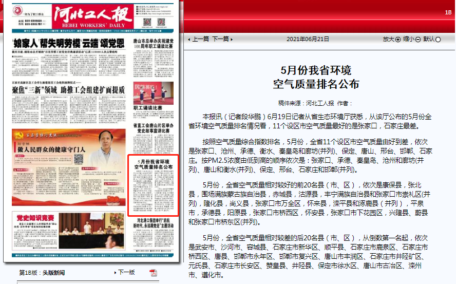河北工人报:5月份我省环境空气质量排名公布